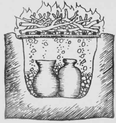 El pozo se hace más profundo que la altura de las piezas. Esto es importante, porque así se evita el riesgo de que un golpe de aire frío las parta. Se empieza un fuego con algunas maderas dentro de éste, y las piezas se van templando colocándolas alrededor de la boca del pozo1. Hay que ir girando para que se templen parejo, después de una hora ya están que no se pueden tocar.[3]