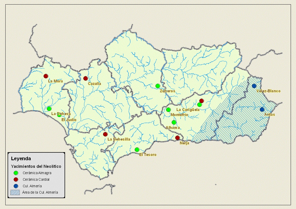 El Neolítico, caracterizado por una economía productiva basada en la agricultura y la ganadería y con nuevas muestras de cultura material como la piedra pulimentada y la cerámica, llegó a Andalucía alrededor del V milenio a. C.. Al ser introducido por difusión desde el Mediterráneo Oriental, las primeras muestras neolíticas se sitúan en el levante almeriense.[1]