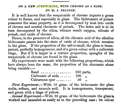 is very dark green and minute spangles of the sesquioxide of chrome are easily recognized in it Third Experiment With 40 grms of the bichromate the fusion is decidedly more difficult and the glass is filled with extremely brilliant crystals Those persons who saw specimens of this glass at once compared it to Venetian aventurine and called it chrome aventurine which name I propose to retain FourthExperiment With 50 grms of the bichromate fusion is extremely difficult The glass is filled with a confused mass of spangles and has no longer the lustre and beauty of the preceding Hence the best proportions for the preparation of the chrome aventurine are these